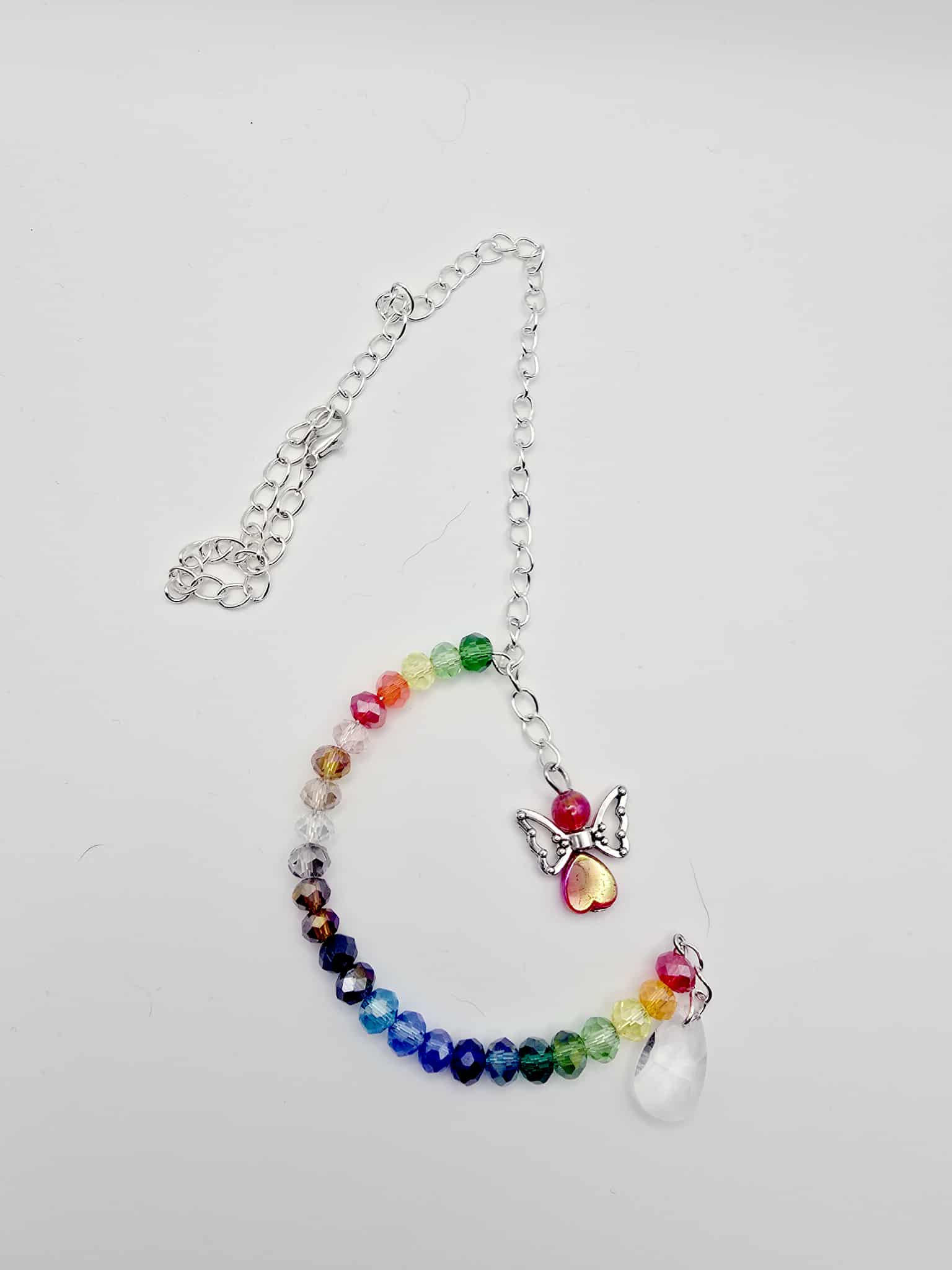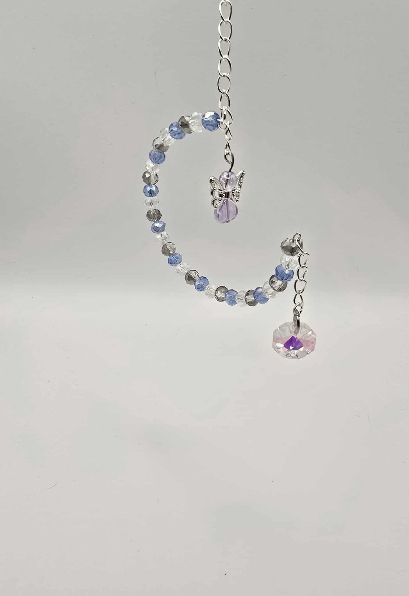 This charming half-moon suncatcher is a delightful addition to any space, allowing you to personalise it with your choice of coloured glass and crystal beads. Each piece is meticulously handcrafted, ensuring that no two suncatchers are exactly alike.You have the freedom to select a theme that resonates with your style, whether it’s a vibrant burst of colors or a more subdued, elegant palette. The suncatcher is designed to hang gracefully, featuring an approximate 25cm chain that culminates in a secure lobster clasp, making it easy to display in your favorite window or outdoor area. To enhance its beauty, the suncatcher is adorned with a delicate crystal dangle that catches the light beautifully, creating a mesmerizing display of reflections. This unique piece not only serves as a decorative element but also brings a touch of whimsy and charm to your surroundings. Perfect for gifting or as a personal treat, this bespoke suncatcher is sure to brighten up any room and add a splash of colour to your day.