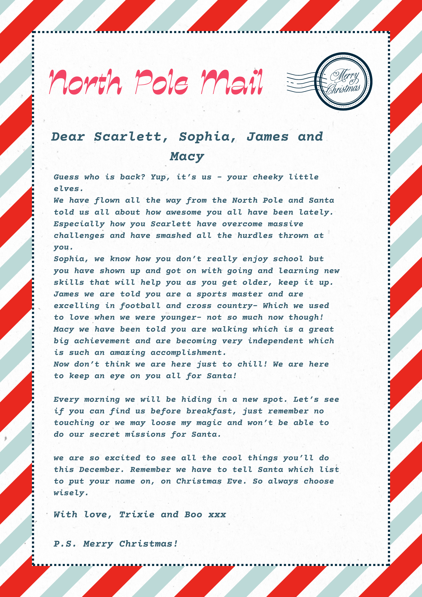 Imagine receiving a delightful return letter from the cheeky elves of the North Pole stating their return to cause mischief and meyhem in your house for the run up to Christmas. Each letter is personalised , making it a unique treasure that captures the whimsical spirit of the holiday season. Printed on festive stationery, these letters come complete with a charming envelope and an address label, ensuring that your correspondence feels special from the moment it arrives. The elves pour their playful personalities into every word, creating a magical experience that will surely bring a smile to anyone's face.