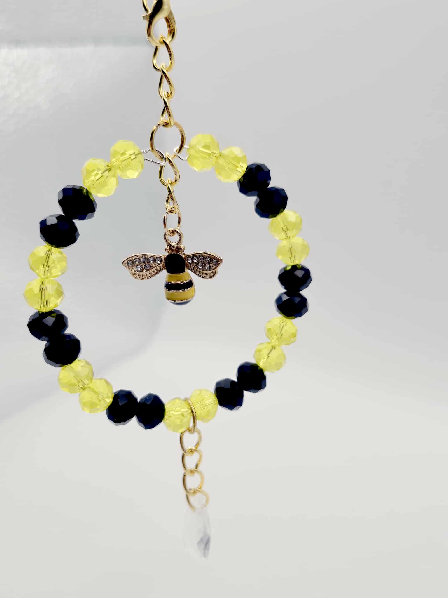 This charming small hoop suncatcher features a delightful combination of black and yellow glass crystal beads, meticulously handcrafted to create a unique piece of art. The vibrant colours not only catch the light beautifully but also add a touch of warmth and cheer to any space. Adorning the suncatcher is a lovely golden bee charm, symbolising diligence and community, which enhances its overall appeal. The design is completed with a crystal dangle that adds an extra sparkle, making it a perfect decorative element for windows or any area where sunlight can illuminate its beauty.