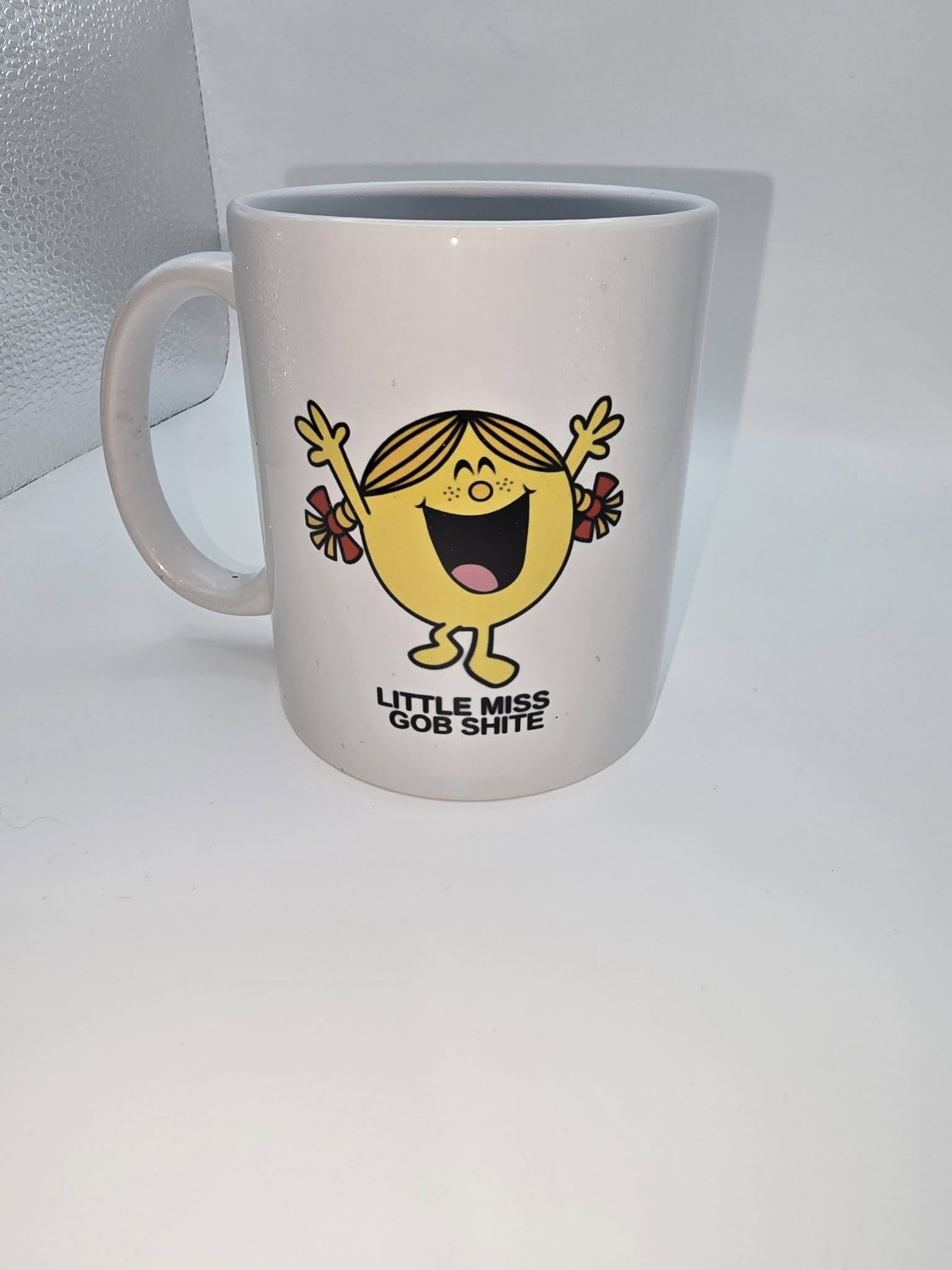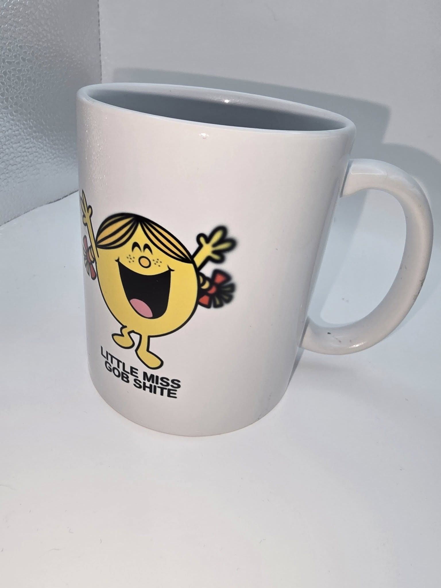 This Little Miss inspired mug features a unique design that has unfortunately experienced a flaw known as 'ghosting.' This defect manifests as a faint shadowing effect on one side of the mug, which does not interfere with its functionality or overall use. Despite this imperfection, the mug remains a charming addition to any collection, especially for fans of the Little Miss series.