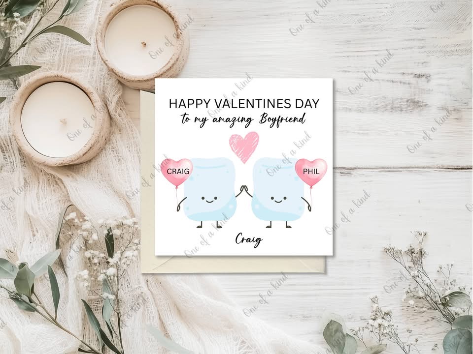 Brighten someone's day with our adorable 6x6 greeting card featuring a cute marshmallow design! Available with charming pink or blue marshmallows , this card is fully personalised to make your message extra special. Perfect for Valentine’s Day, it’s a delightful way to show you care. Grab yours today and spread some joy