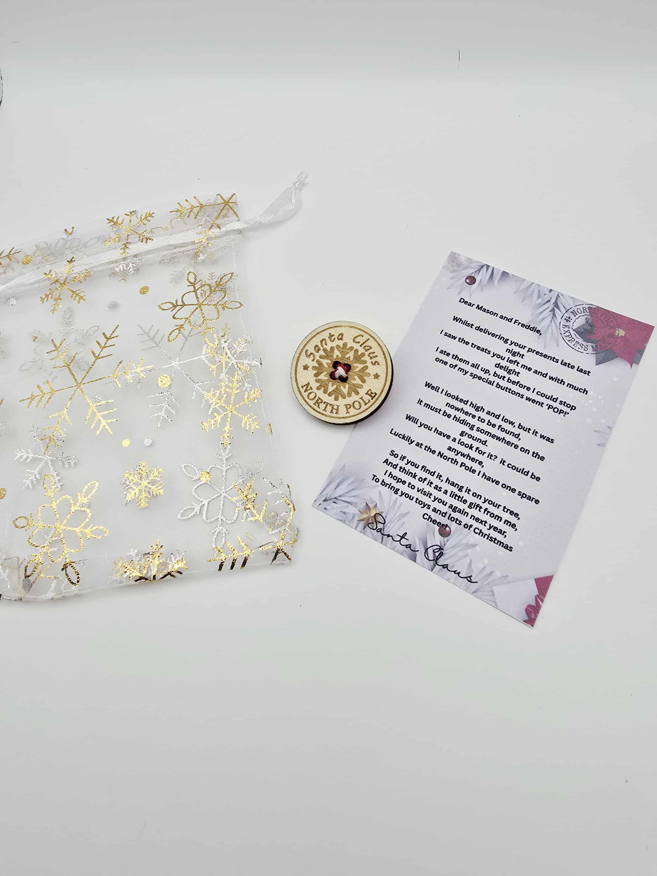 To enhance the experience, the button and poem come elegantly packaged in a lovely organza bag, perfect for gifting or keeping as a treasured memento. The soft, sheer fabric of the bag adds an extra layer of charm, making the entire presentation feel magical and festive. This thoughtful combination of a personalised poem and a whimsical button not only sparks imagination but also creates lasting memories for children and families alike.
